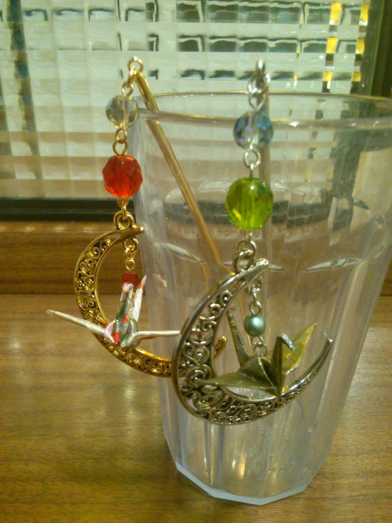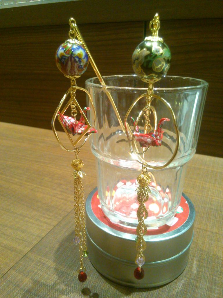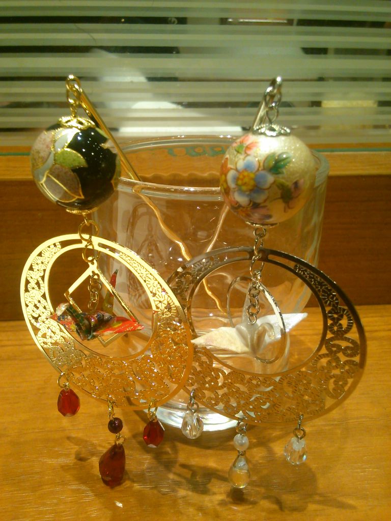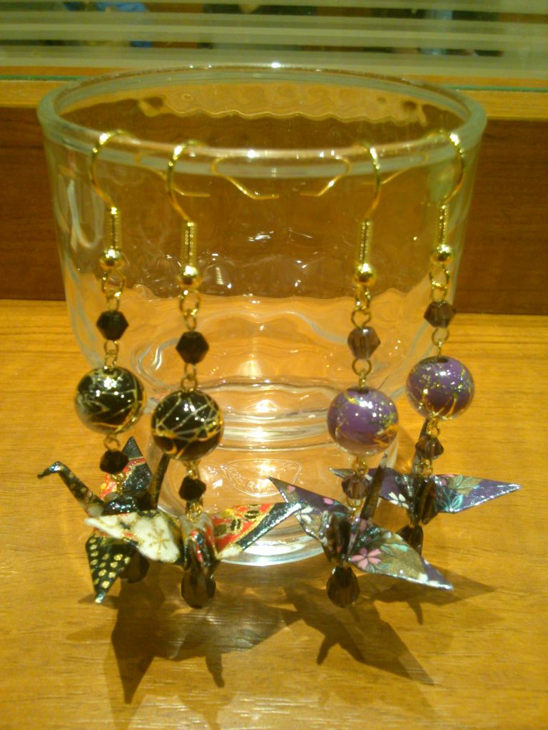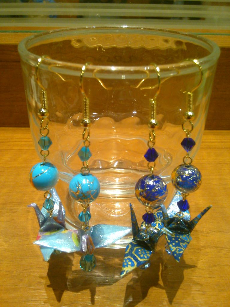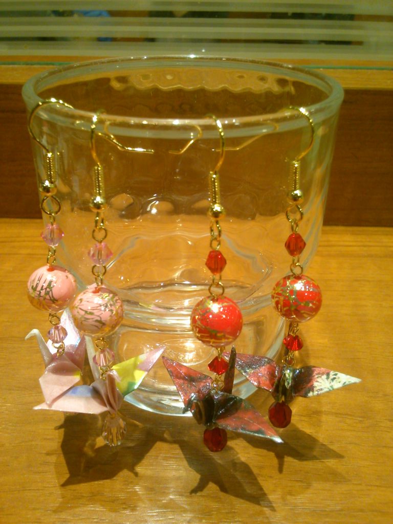 折鶴は大量にありますが、同じ柄を選ぶのは意外に困難かもしれません(^^;)。片耳のみ、左右異なるデザインなども承りますので自由にお選びください。大きさは大小2種類あります。