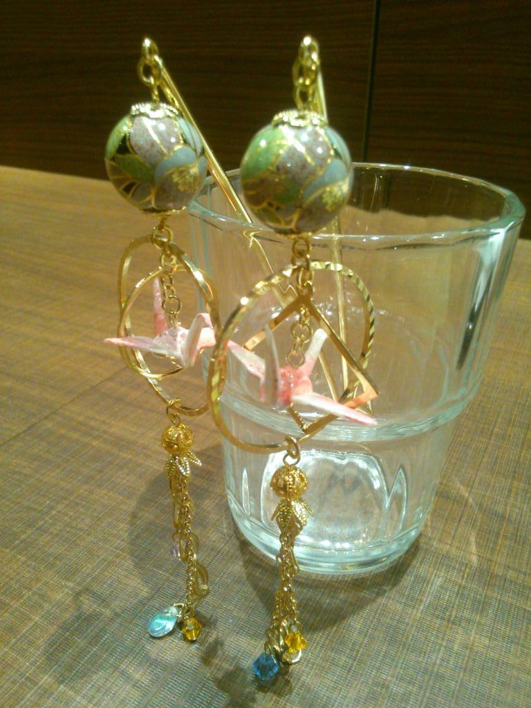 ベースは金と銀の2種類、イヤリング、ピアス両方可能です。金属アレルギーの方のために樹脂ピアス、樹脂イヤリングもご用意しています。樹脂イヤリングのみ、ちょっとパーツが高いため+100円となります。折鶴にチェーンのみなど、シンプルなデザインでもOKです。