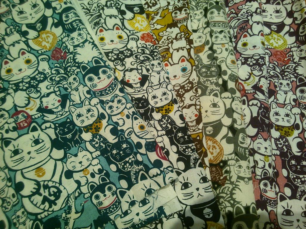 今回だいぶ多めに搬入しますが、妖怪イベントはしばらくちょっとお休みする予定です。材料となる妖怪に使えそうな柄の布がね、ネタ切れなんです(^^;)。妖怪柄って毎年毎年出るわけじゃないですからね~。今年はようやく手に入ったのが上の招き猫柄と鳥獣戯画と、落ち武者(実はただの鎧兜に刀)くらい。