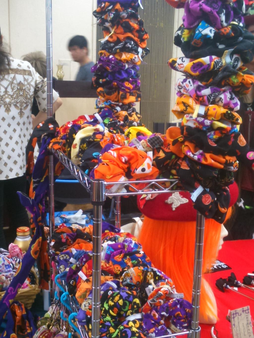 今回はハロウィンスペシャルということで、ハロウィン柄のシュシュをとにかくたくさん用意しました。ドーナツみたく棚に並べ、更に支柱にイカリングのように積み上げてみたりしてww