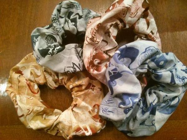 シュシュは、いつも大量に用意してるし、布の柄も結構手当たり次第に作っているところがあって、あまり紹介とかしたことなかったんですよね。今までに紹介したことあるのは、ハロウィンの時と去年の夏にチャイナのシュシュをたくさん出した時、後はここ最近テーマに添って作ってるので、狐だったり鳥だったり妖怪だったりとかかな。