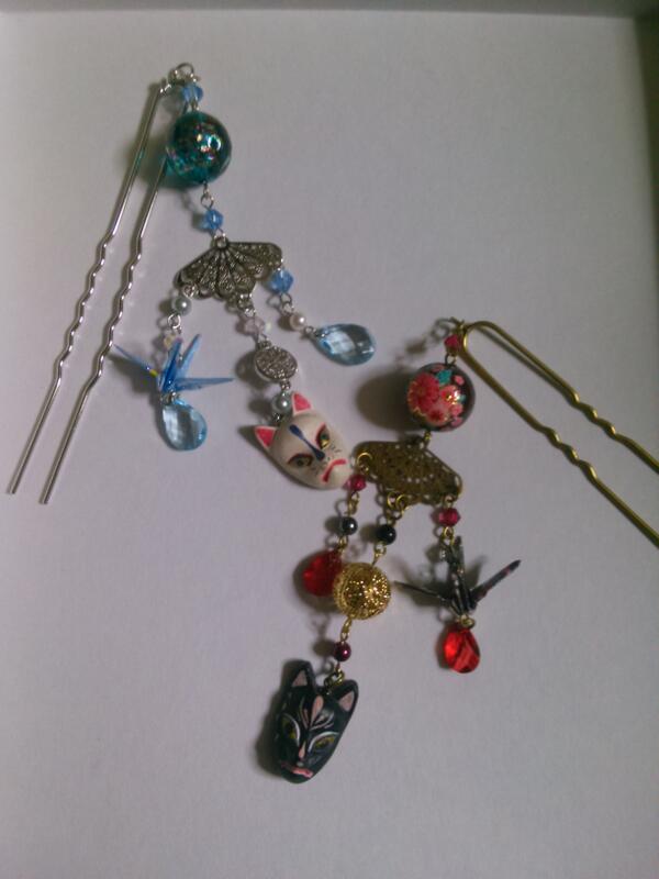 今回は金ベースに黒と赤、銀ベースに白と青でまとめてみました。せっかくなのでちょっと格好つけて、黒い方を「玄翼」、白い方を「白鱗」なんて名づけてみます。狐面のパーツは「Silver Star~銀星堂~」の水月舞香さん製作です。玄翼は、よく見ると狐面のこめかみに桜の花びらが散っているのですよ! 何て芸の細かい! もう、手放すのが惜しいくらいだ! ハァハァ(っ*´Д`)っ