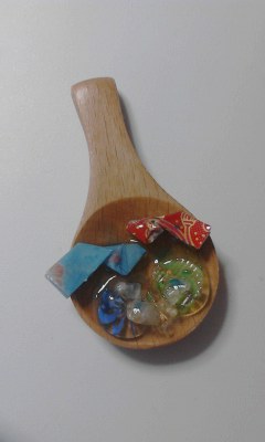 土台に使ってるのは、100円ショップで見つけた中国茶用の茶さじ。本当は他のアイテムを探して歩き回ってたんですが、見つけた時にお、と思ったので試しに作ってみました。紐を通すための穴を自分で開けないといけないのがちょっと難点なんですが(^^;)。