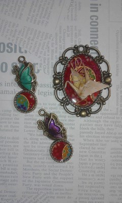 小さい二つは先日ヤフオクで落とした蝶のを使ってみたもの。羽の淵に石を置く予定なのでまだ未完成ですが、色合いとかどんなもんかなと思って。この大きさだと、ピアスとかイヤリングが良いのかしら。セットで作ってみよう、うん。