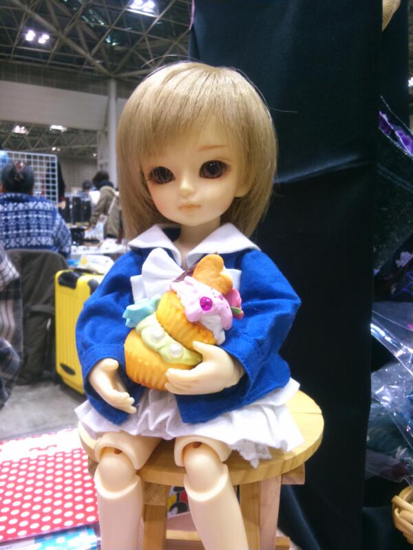今回、ブースの写真は一応撮ったんですが、今一つ気に入らないなぁ、もっかい撮り直そうなんて思っているうちに新作がお嫁に行っていまったので、お隣で出張モデルしたねむの写真を。「ちょこちょこ庵&こばと洋菓子店」さんにて、カップケーキを欲張る図。