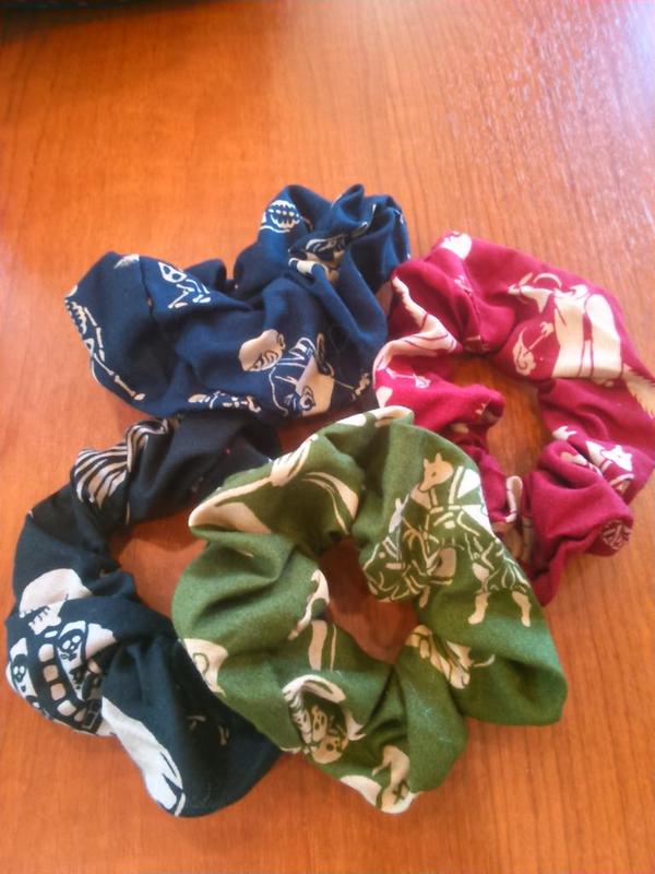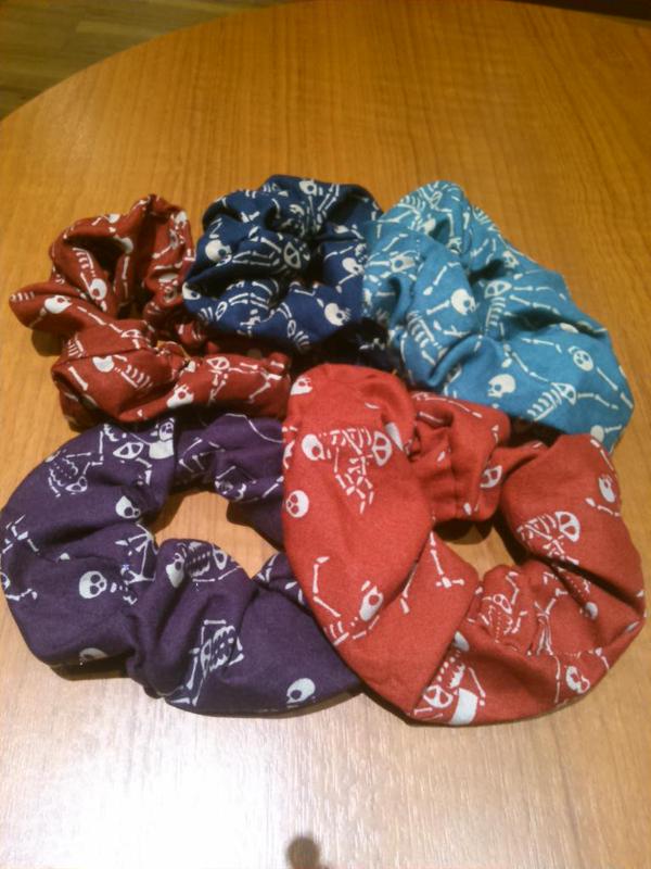 上段:骨輪 人骨組み合わせて車輪のようなデザインになっているという、恐ろしげなデザインですが、シュシュにしてみたら意外と可愛くまとまりした。